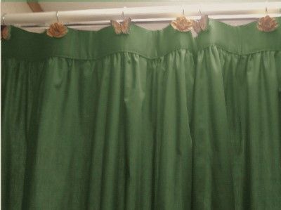 This pretty dark sage gathered Shower Curtain features simple, solid pale green broadcloth with slight curtain-like gather. Features 12 reinforced buttonholed top to accept your favorite hooks.