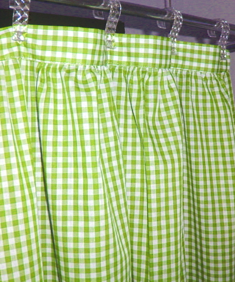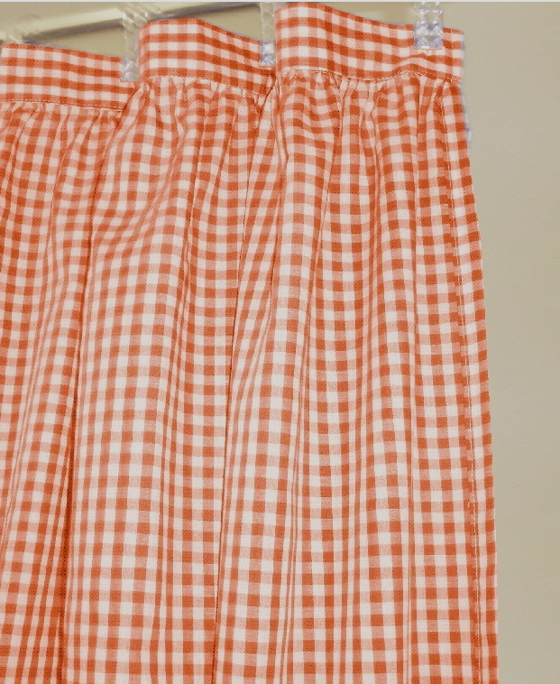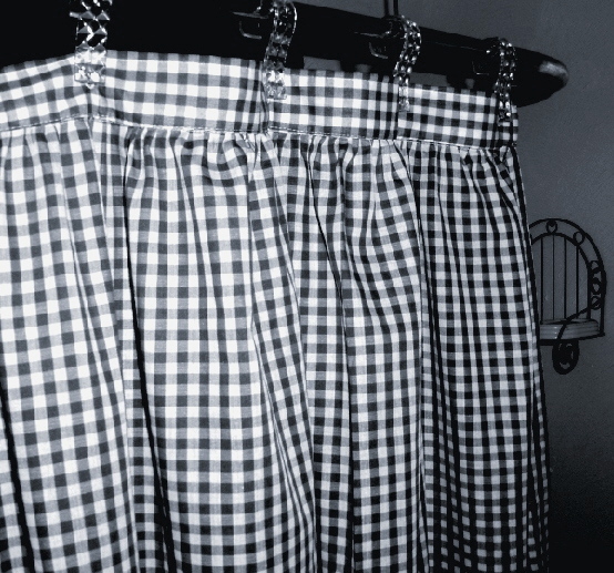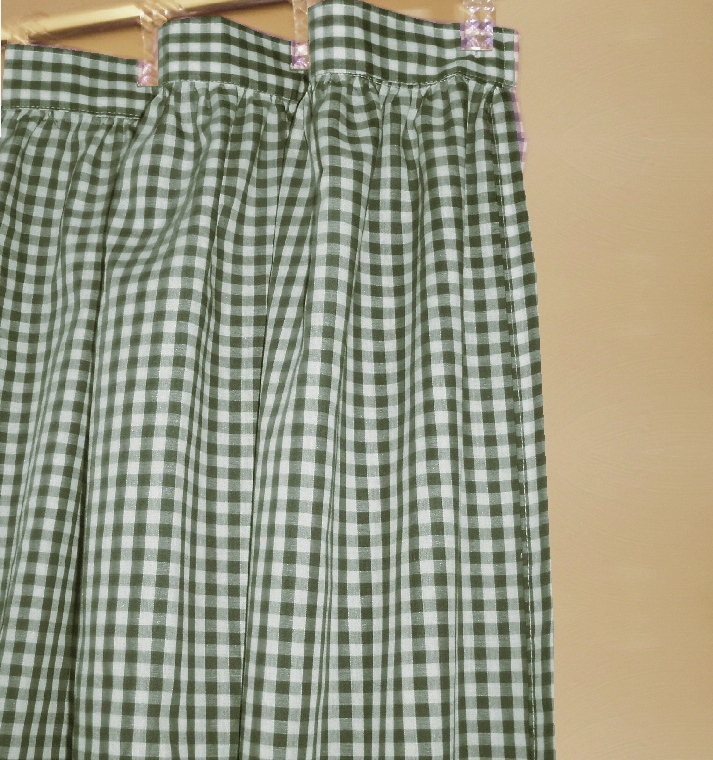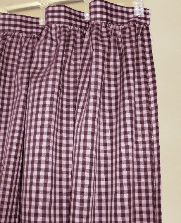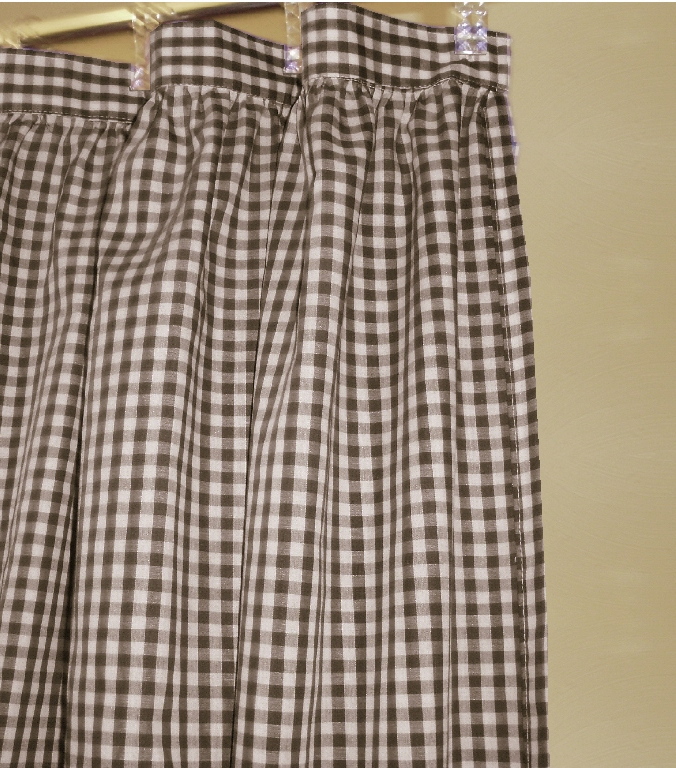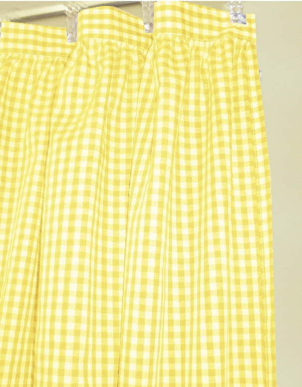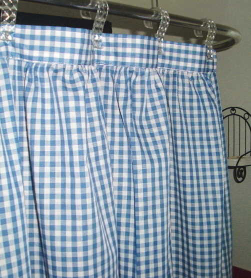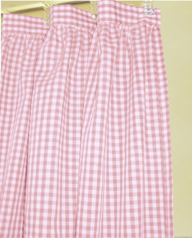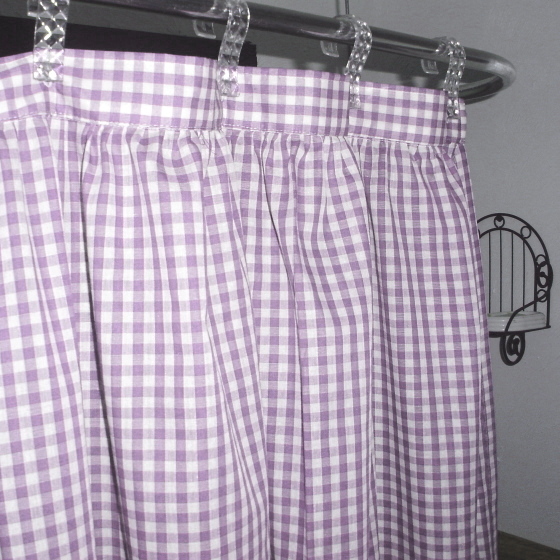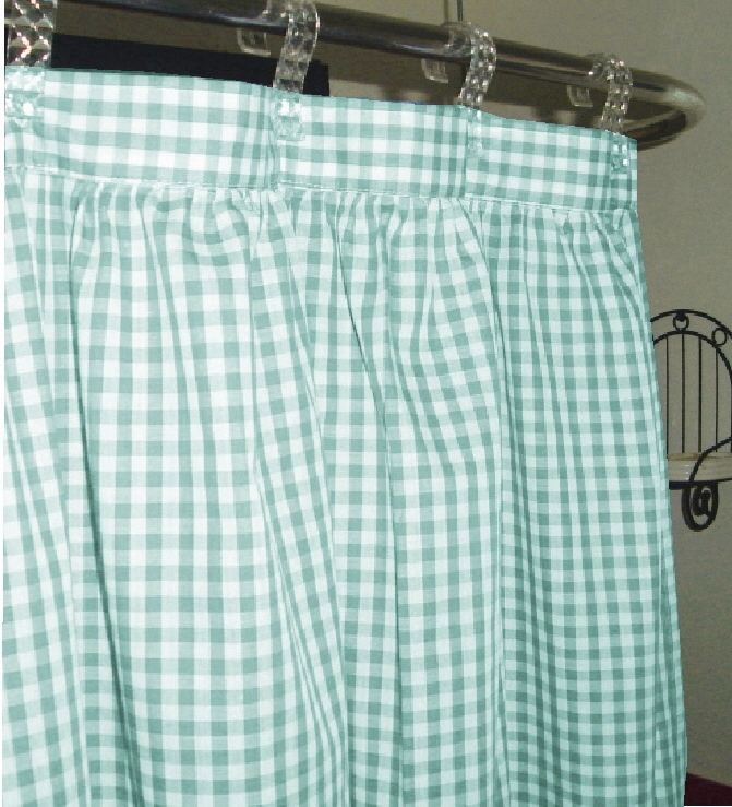 Pretty gingham check fabric shower curtain multiple colors and 1/4 and 1/8 inch checks. Slight country-like gather at top with 2" header that hosts 12 button holes to accept hooks. Easy care Poly/cotton blend lightweight fabric that matches our kitchen/café tier curtains and valances. Measures 72x72. Washable, gentle, low tumble dry and cool iron if needed. Constructed of polyerster/cotton fabric for easy care. For use with liner,