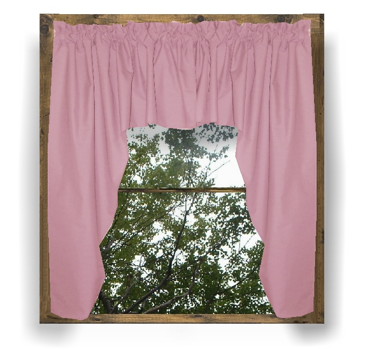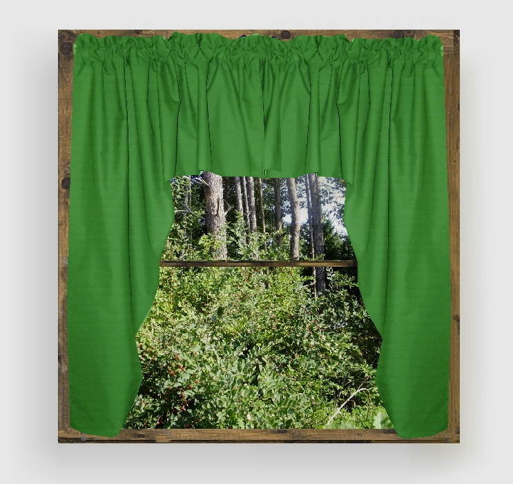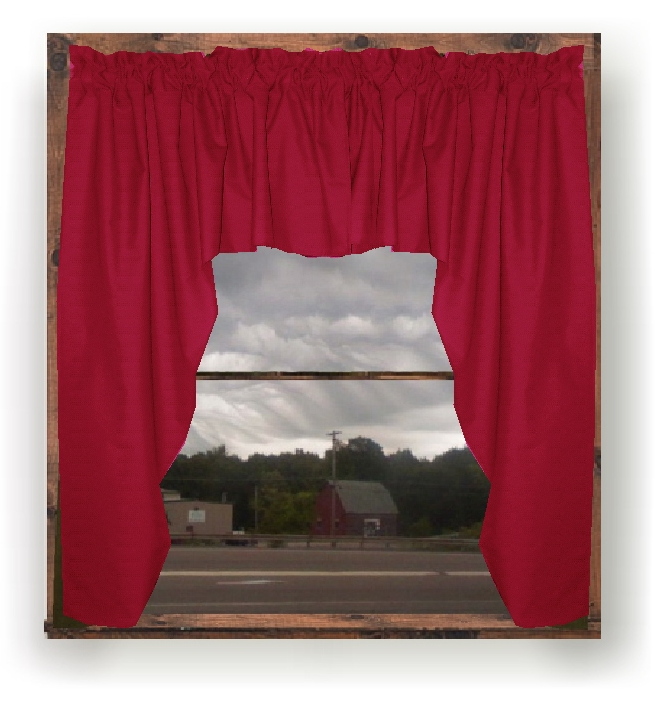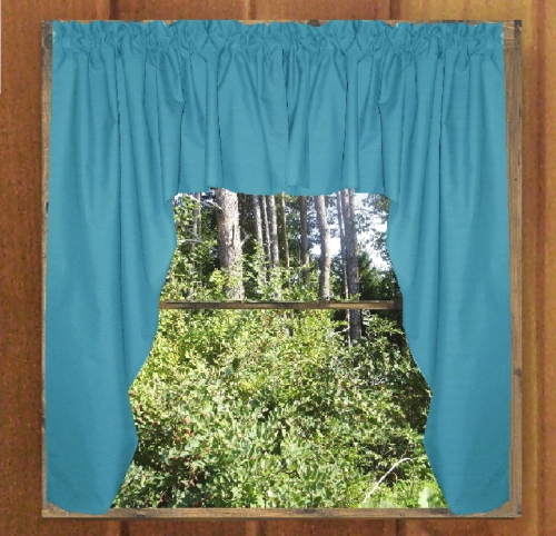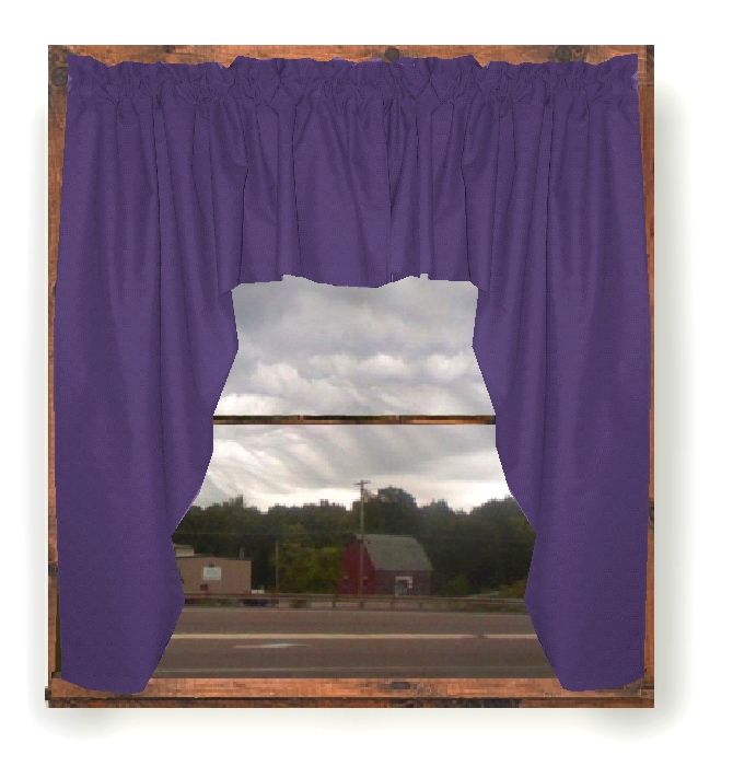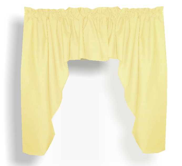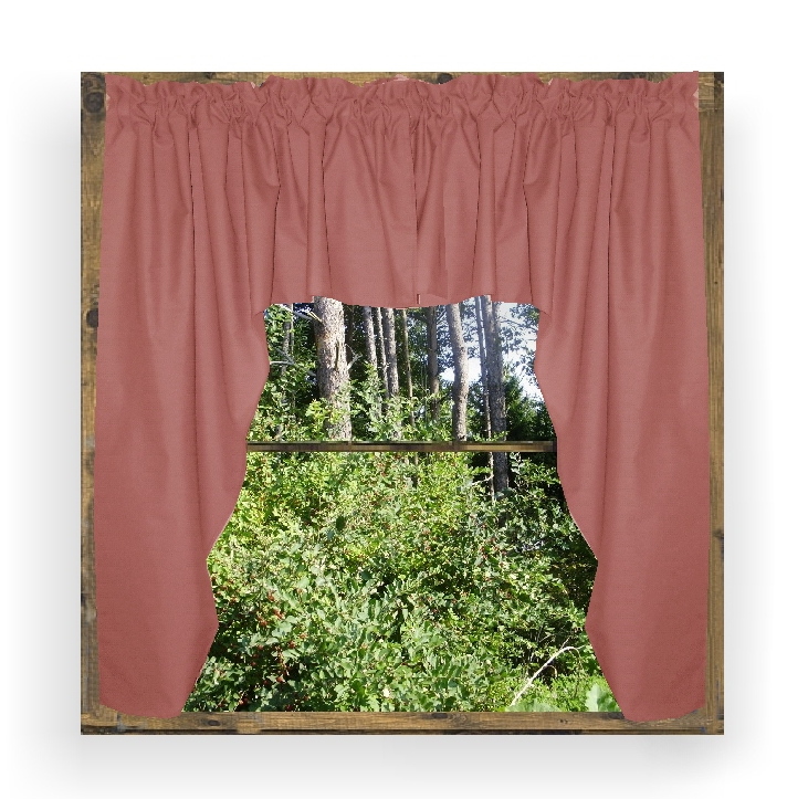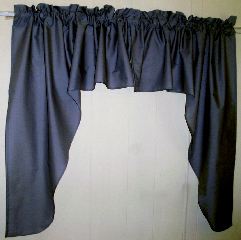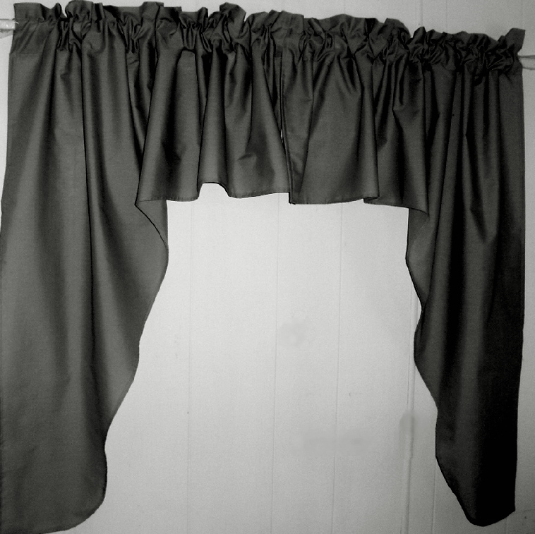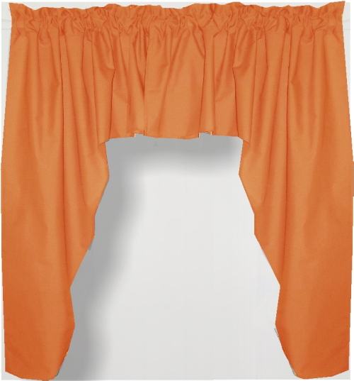 Solid colored swag window Valance available multiple colors. Constructed of perma-press poly/cotton fabric with or without lining. Pair includes right and left pieces with total width about 74" wide. Long side lengths vary and short center length is about 14 inches. Fits windows up for 40" wide. Order extra center for wider windows. Extra Center Piece measures 40" wide and about 14" long.