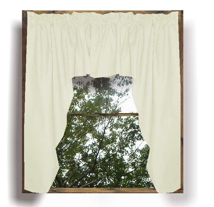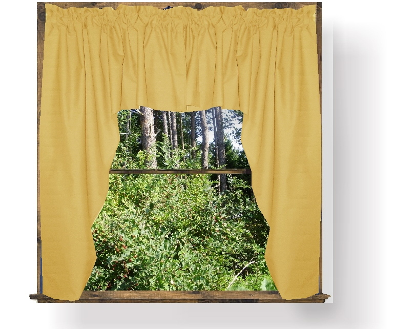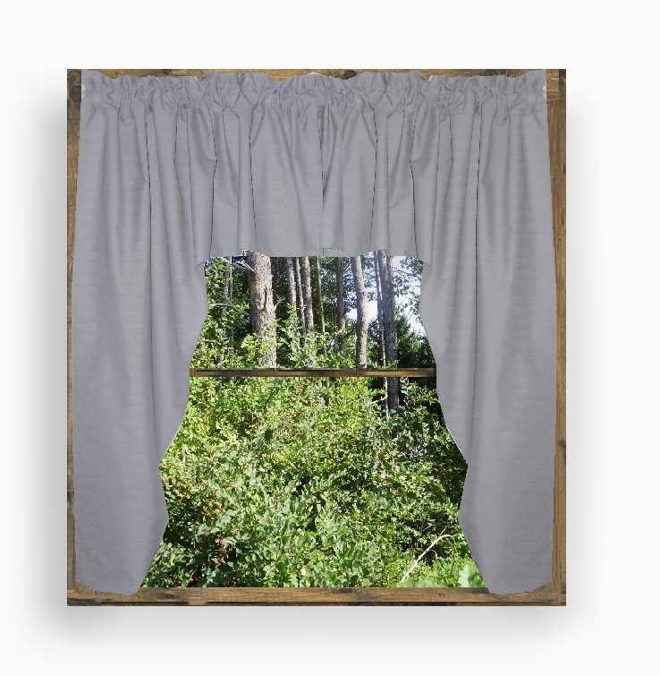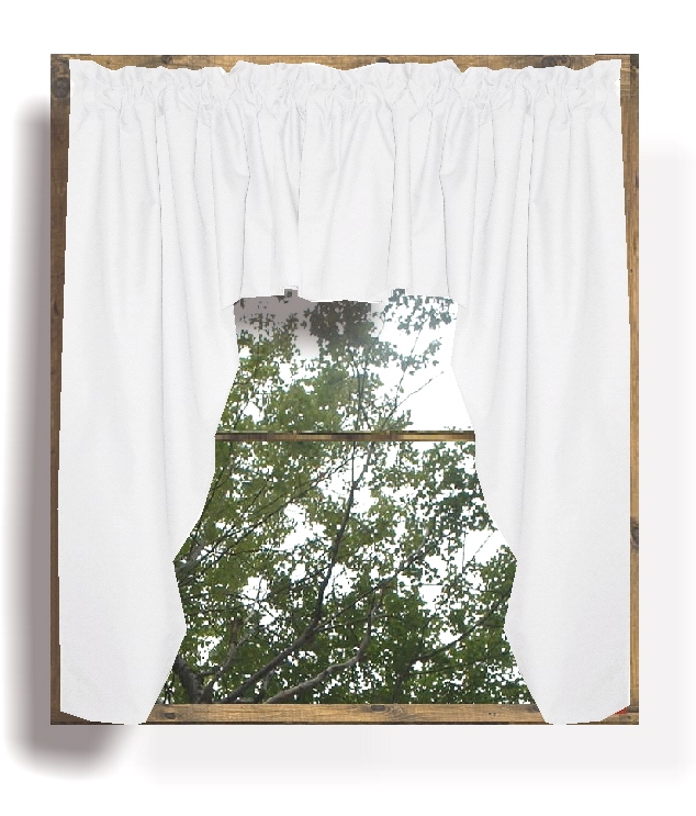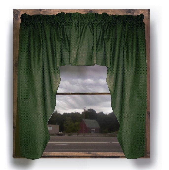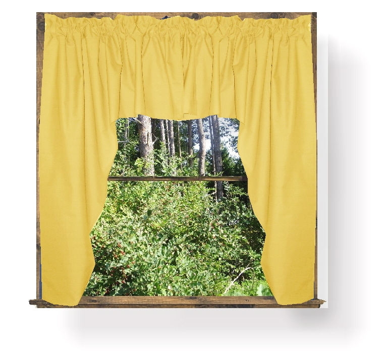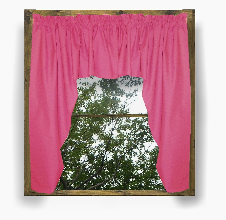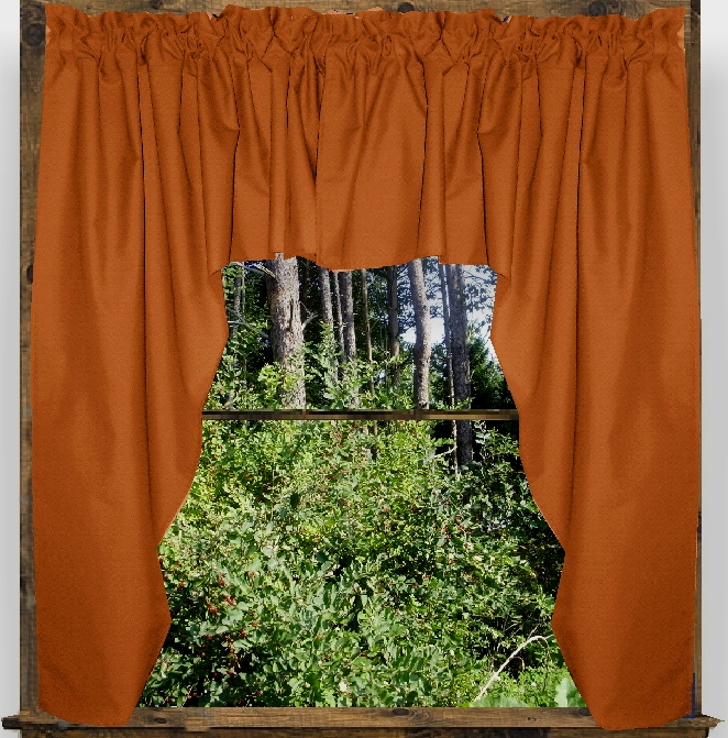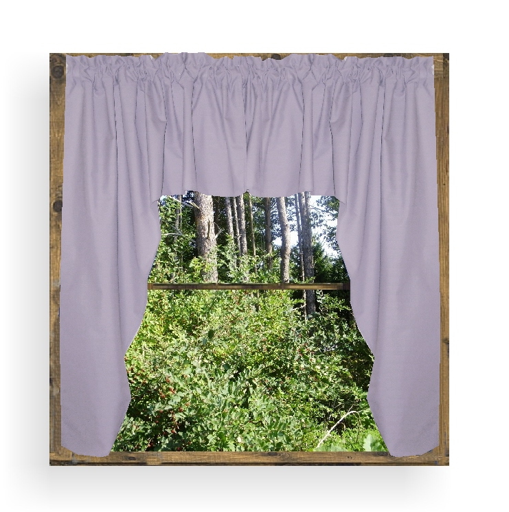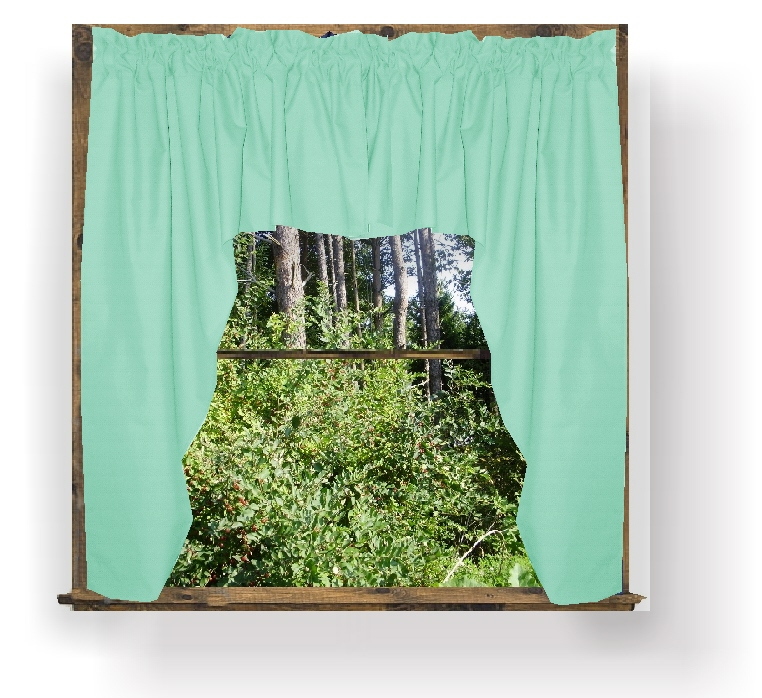 Solid colored swag window Valance available multiple colors. Constructed of perma-press poly/cotton fabric with or without lining. Pair includes right and left pieces with total width about 74" wide. Long side lengths vary and short center length is about 14 inches. Fits windows up for 40" wide. Order extra center for wider windows. Extra Center Piece measures 40" wide and about 14" long.