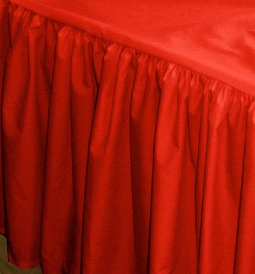 Deep Rich red ruffled bedskirt in regular or extra long sizes. Available in Crib size 28x52, Daybed, Twin, TwinXL, Full, Queen, Olympic Queen, King and CalKing. Split corners to allow use with posted beds.